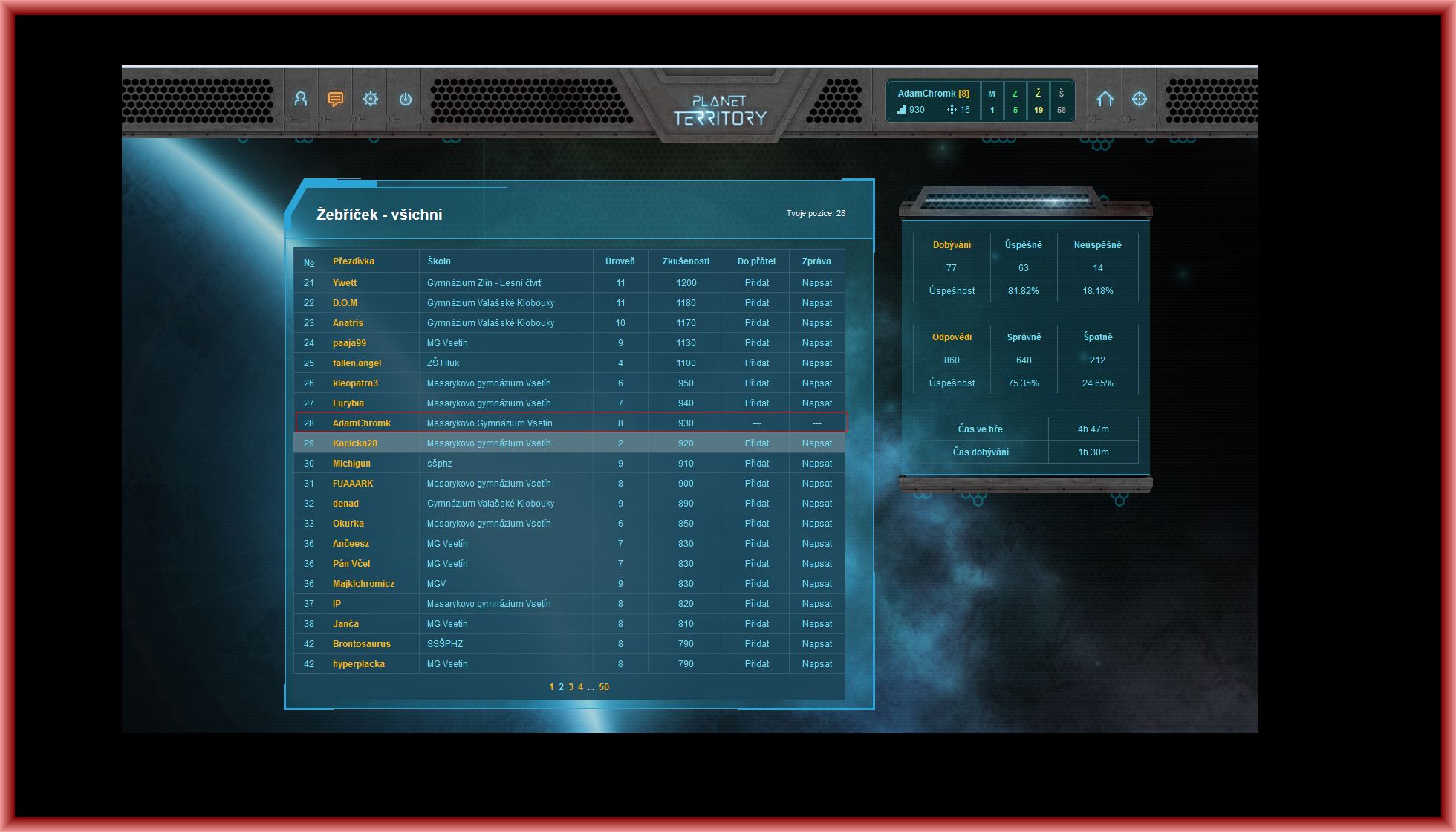 28.09.2014 12:40Planet Territory je hra, která má ověřit vaše přírodovědné, zeměpisné, chemické a fyzikální znalosti. Dobýváte planety a svádíte souboje s dalšími hráči. Postupně se zlepšujete a posouváte se v žebříčku nahoru až na první místo,( tohle nebyl náš cíl, my jsme se měli dostat pod třicáté místo v žebříčku). Moje vesmírné eskapády mě vynesly 28. místo v žebříčku.